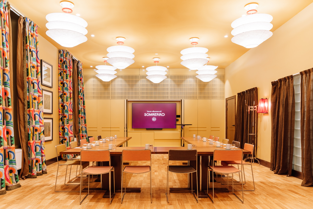 Not your average meeting room, The Salongen is our flexible space, perfect for informal gatherings and those looking to hang out for the whole day. Whether it's a breakfast event, a casual drinks reception, an intimate dinner, or all three, we can flip the room's set up throughout the day to fit your needs. And with its glass brick wall that takes its cues from Villa Stenersen, Oslo's modernist gem, and a vibrant rainbow colour scheme inspired by a vintage rya - a traditional Scandinavian wool rug - the bright and airy space is ideal for those looking for a relaxed and dynamic option.