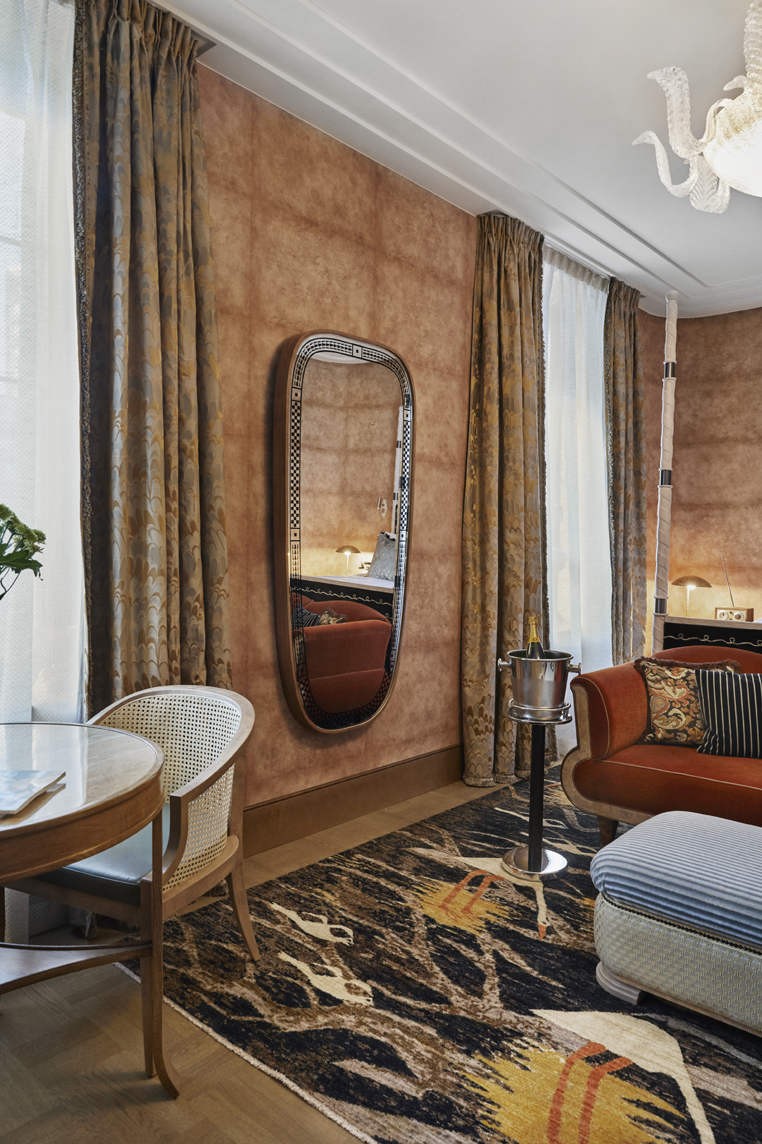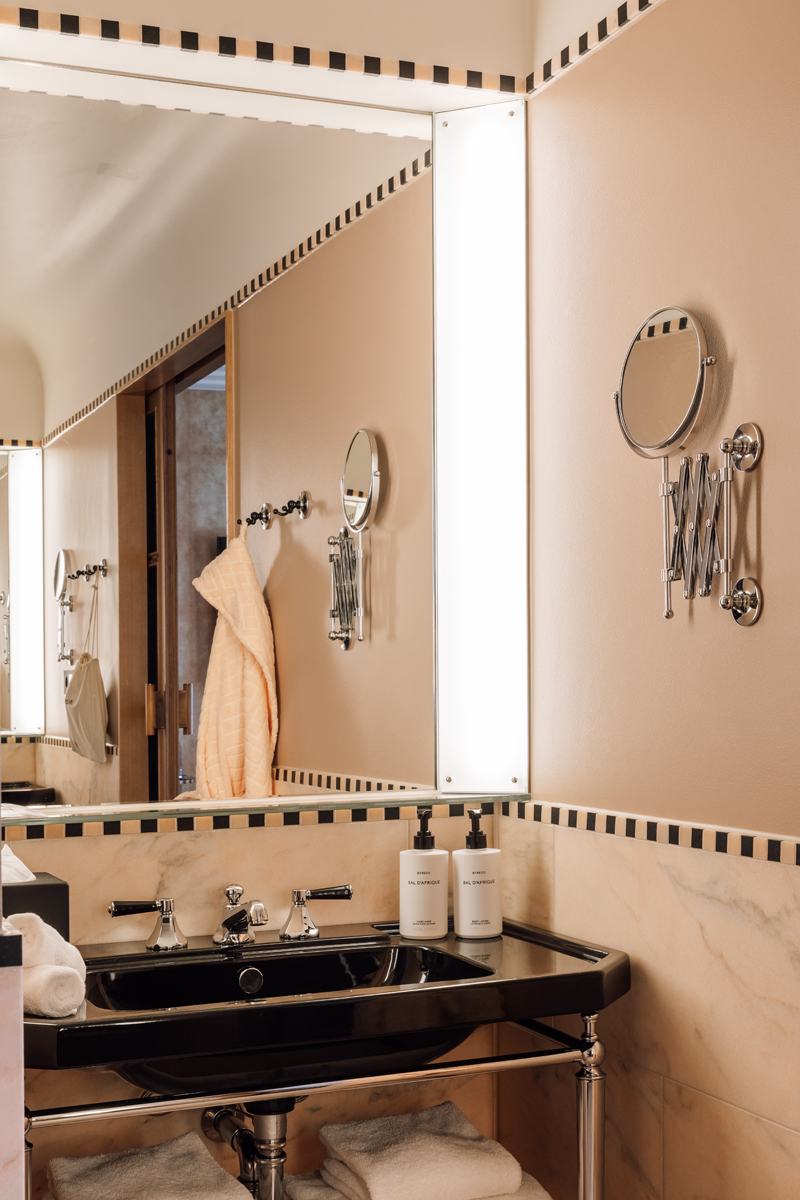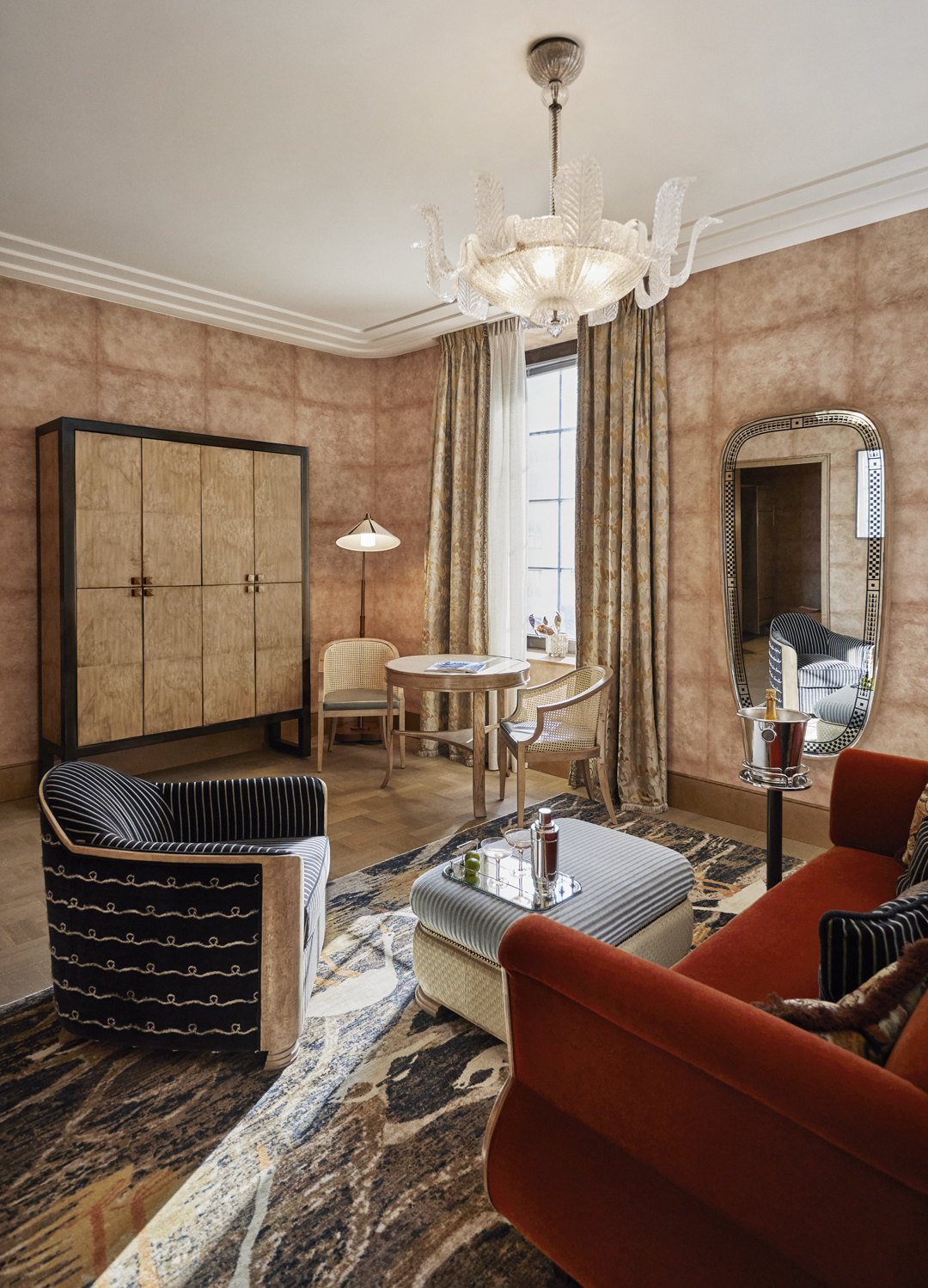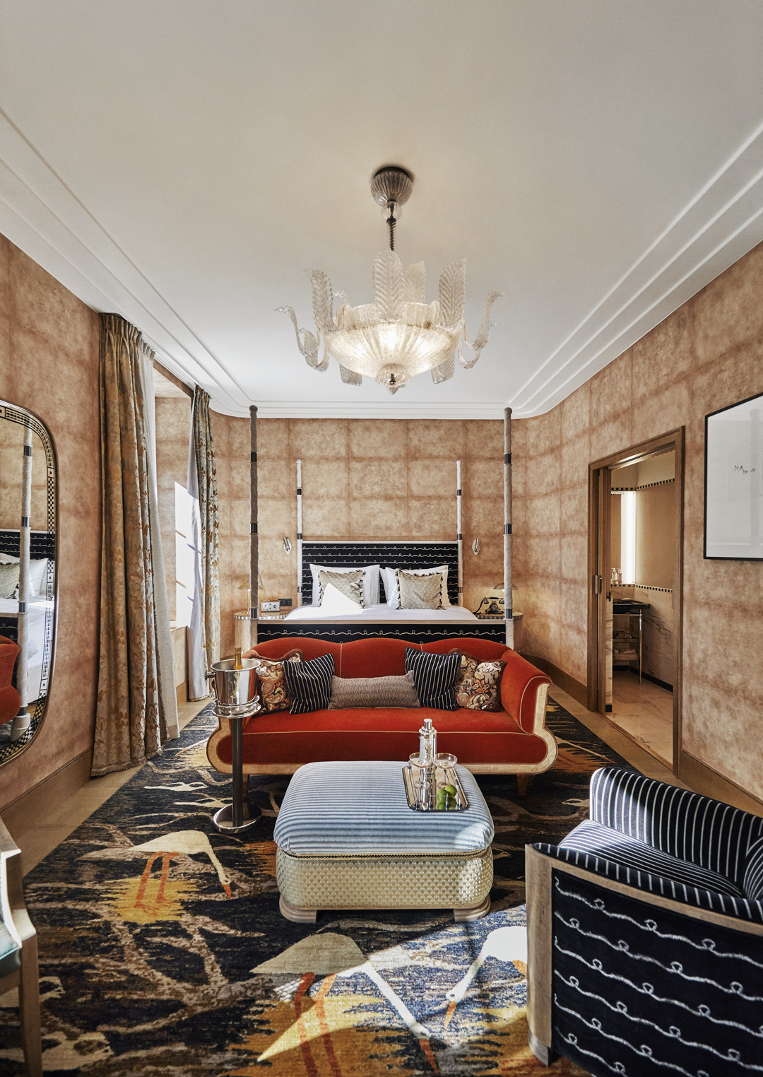 Otherwise known as the 'wow' room, our Junior suite is decked out with a fancy Murano glass chandelier, a bleached oak chrome-detailed king-size four-poster bed and an established seating area with bespoke furnishings upholstered with a fabric pattern inspired by Norwegian artist, Gerhard Munthe. Not to mention the bathroom, which is clad in dusty pink marble and comes complete with a twin basin, a walk-in shower and a deep-soaking tub.