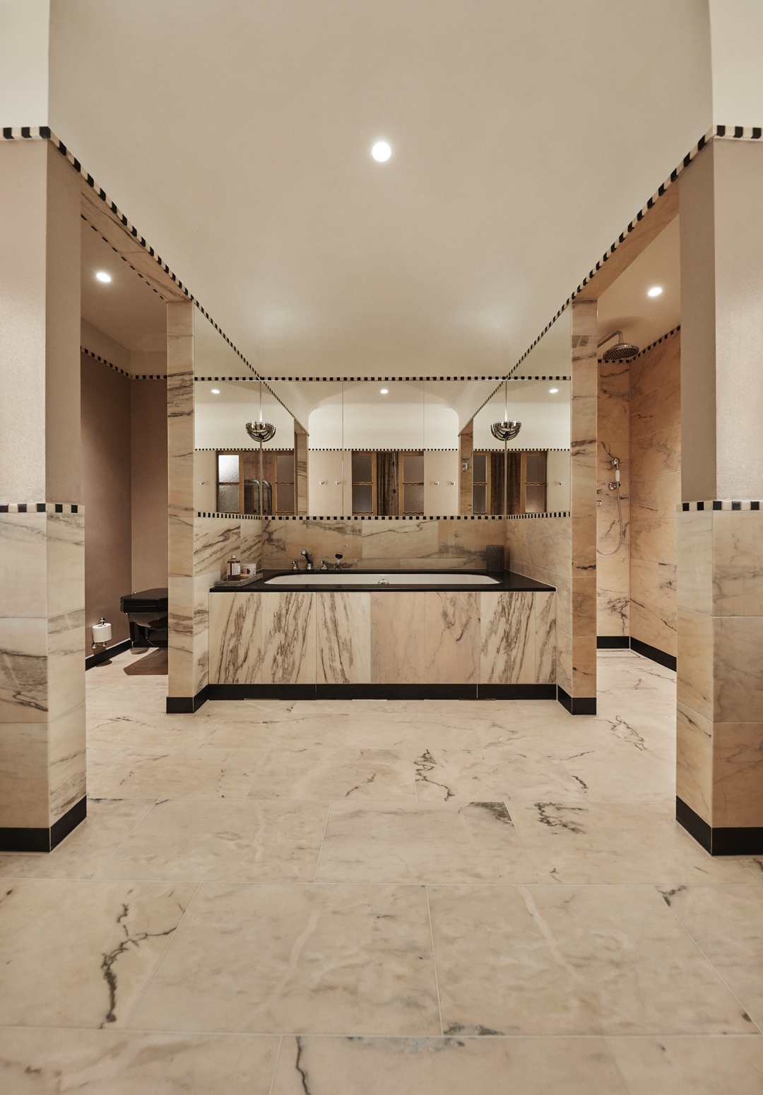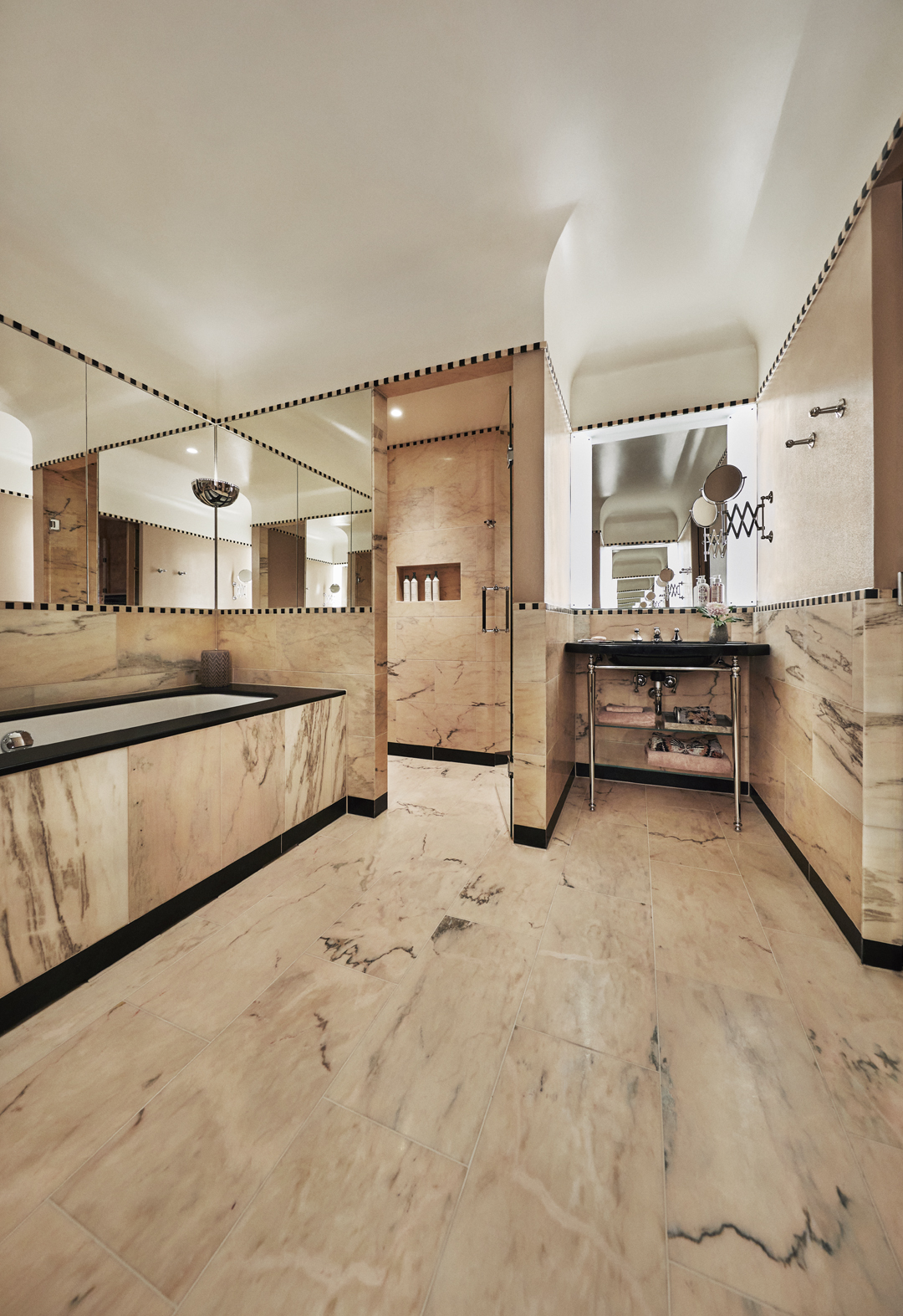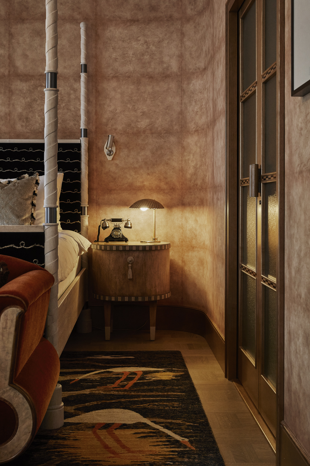 Otherwise known as the 'wow' room, our Junior suite is decked out with a fancy Murano glass chandelier, a bleached oak chrome-detailed king-size four-poster bed and an established seating area with bespoke furnishings upholstered with a fabric pattern inspired by Norwegian artist, Gerhard Munthe. Not to mention the bathroom, which is clad in dusty pink marble and comes complete with a twin basin, a walk-in shower and a deep-soaking tub.