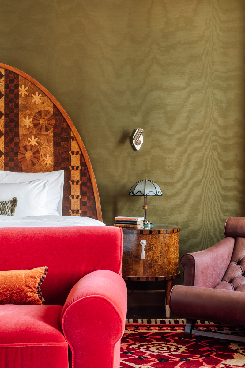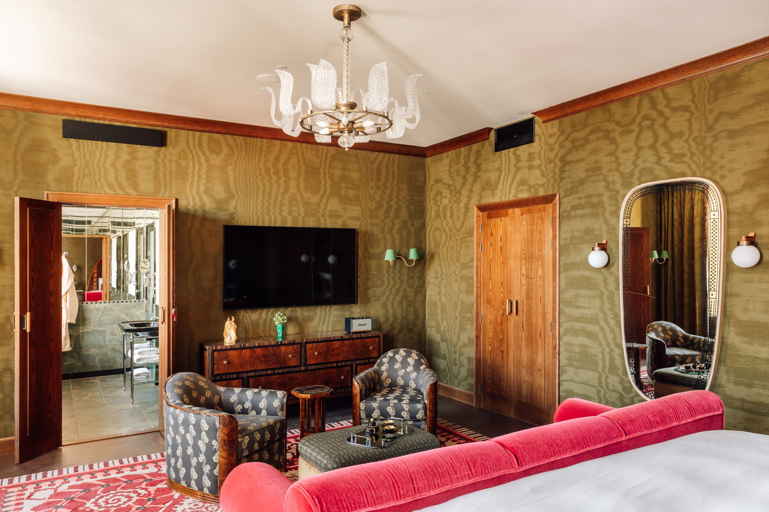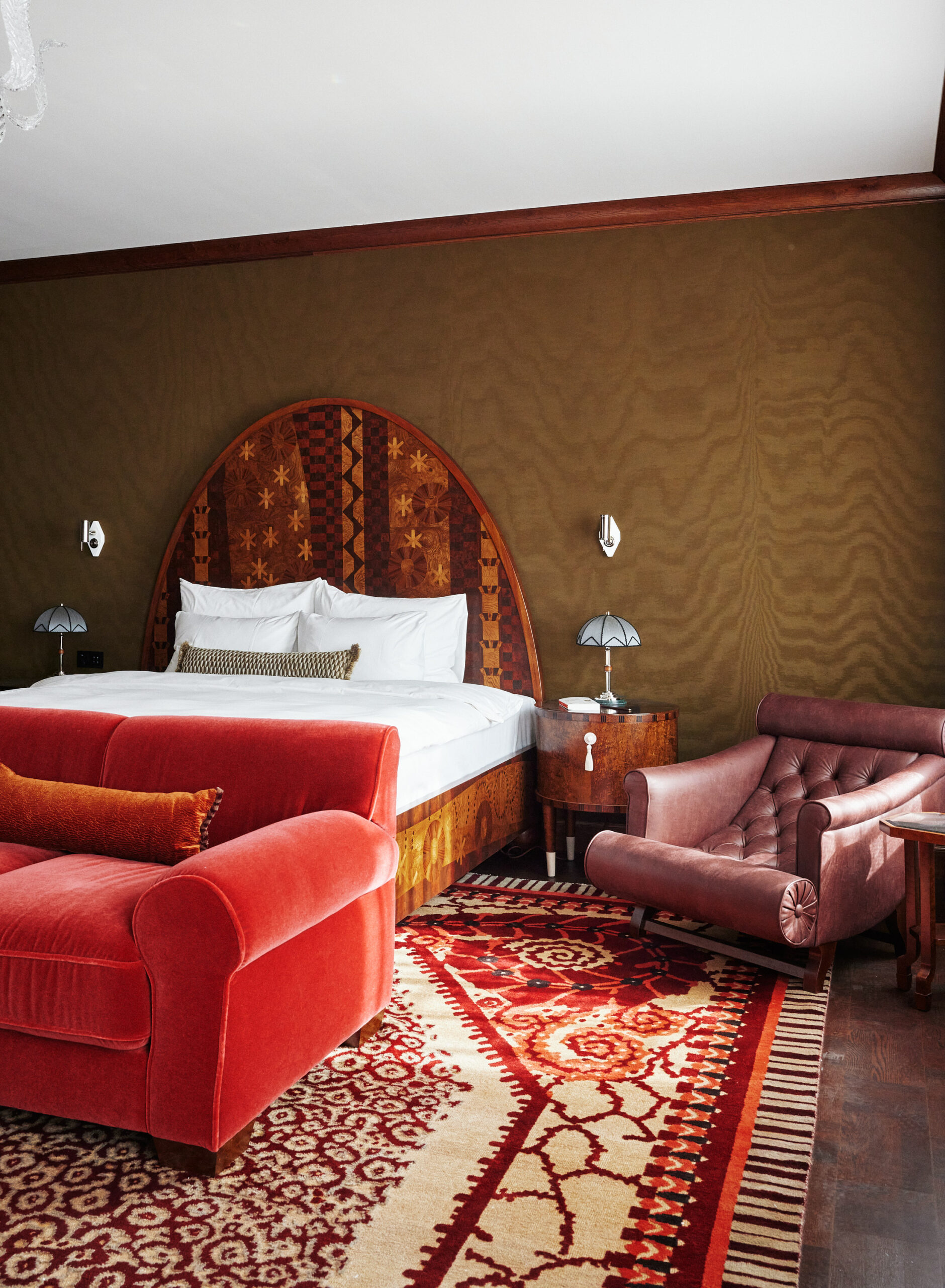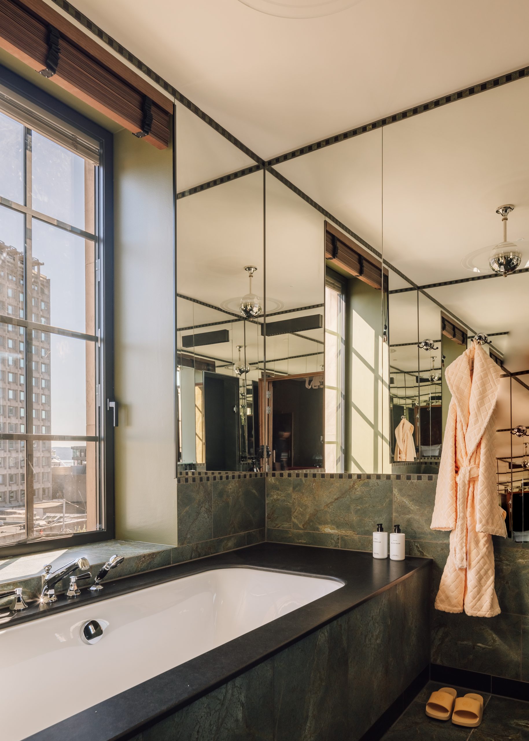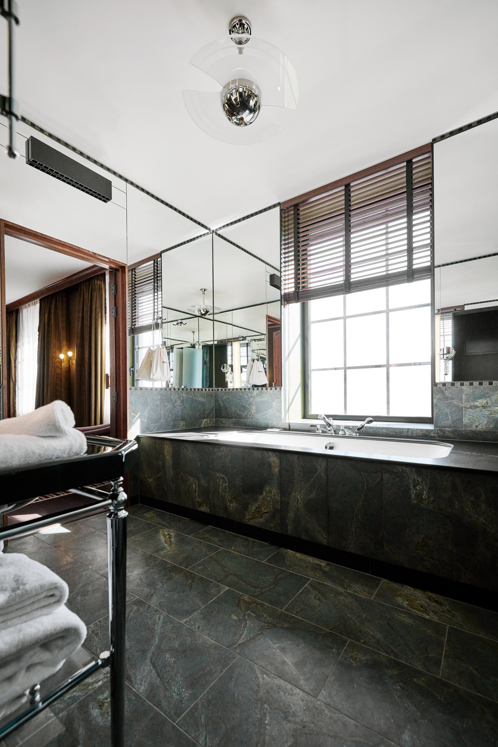 There are lots of opulent details from a grand super king-size bed backed by a headboard inlaid with timber and mother of pearl, velvet wall coverings and sofas, a walk- in wardrobe and a guest lobby and toilet. Like the Junior suite, the bathroom has a twin basin, walk-in shower and a deep soaking tub, alongside loads of natural daylight from the window that looks out onto Somerrogata.
