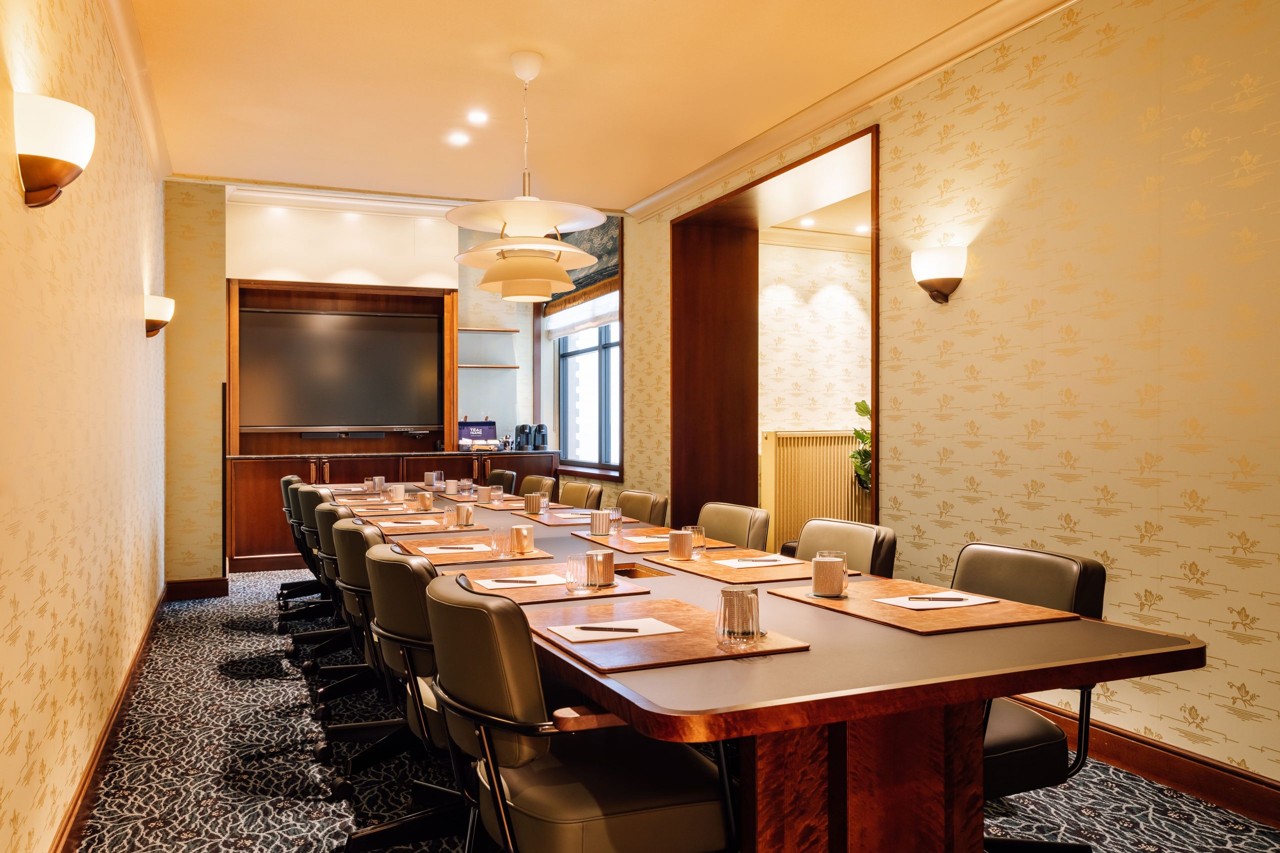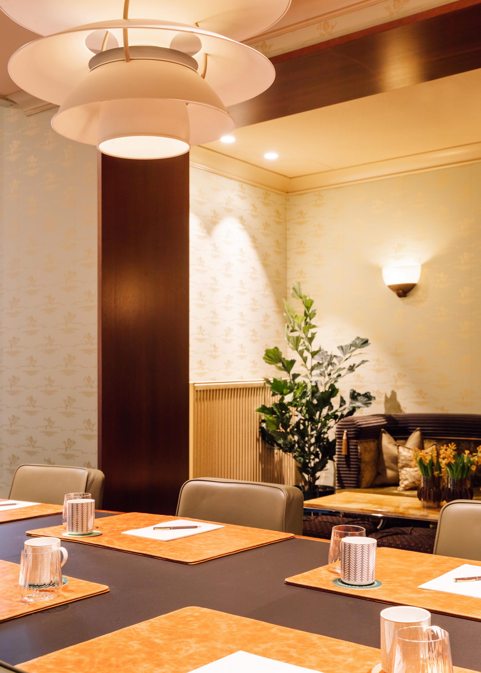 Store vindusflater bringer utsikten inn i rommet. Delikat lyssetting og beplantning bidrar til en intim atmosfære som gjør møterommet egnet til private middager på kveldstid. Personlig service, full diskresjon og alle tekniske fasiliteter er en selvfølge.