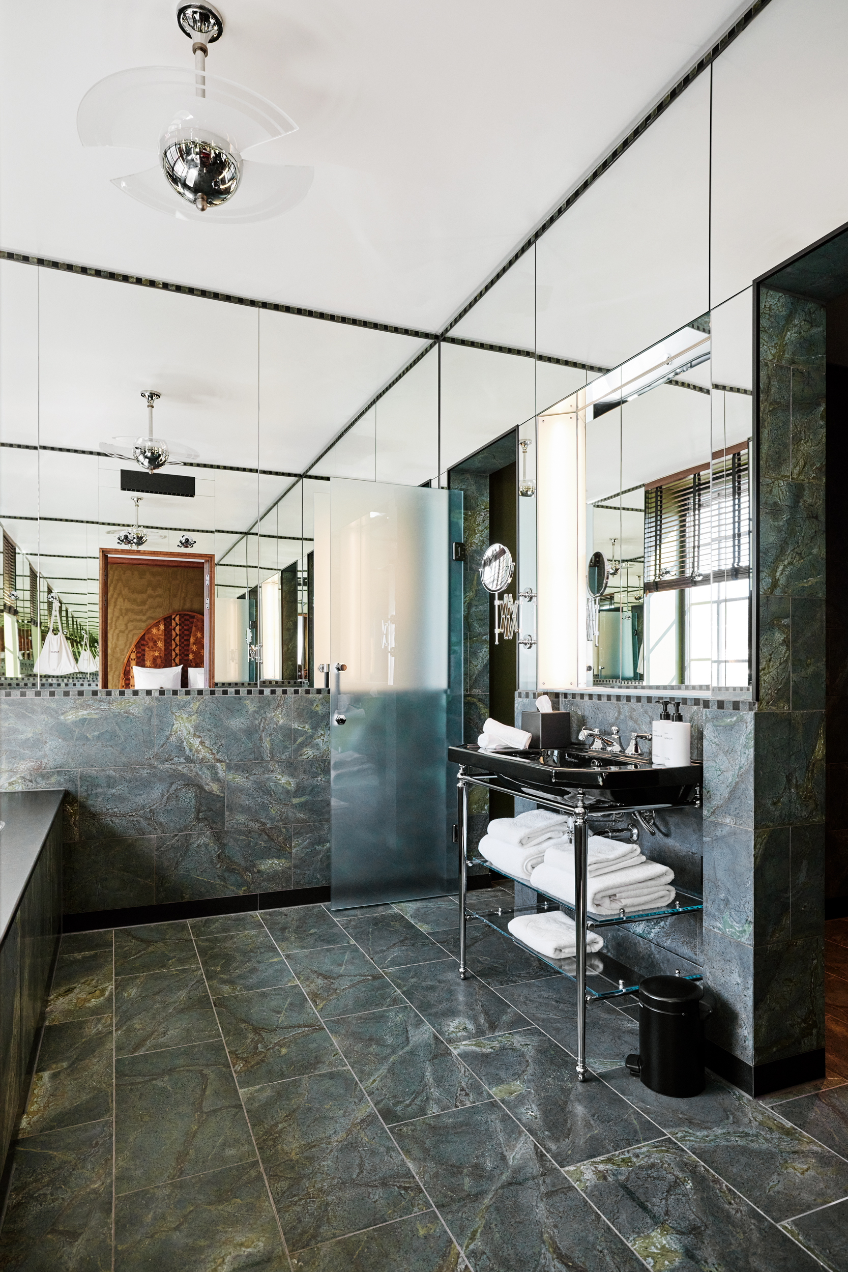 Våre tre suiter tar i bruk gamle Oslo Lysverkers verneverdige direktørkontorer og møterom i en glamorøs ode til byggets arkitekter, Andreas Bjercke og Georg Eliassen. Her kan du jobbe, sove, sosialisere og – ikke minst – nyte. Mosegrønn velurtapet setter stemningen for det lune interiøret innredet med skulpturelle lampeskjermer i silke, en romslig arbeidsplass ved vinduene, et kunstverk av en dobbeltseng og håndknyttede gulvtepper inspirert av nordisk kulturarv. De polstrede møblene er trukket i glansfull mohair, og det ekstravagante badeværelset i grønn, brasiliansk stein er innredet med servanter, dusjer og badekar med utsikt. Her er det virkelig ikke spart på noe.